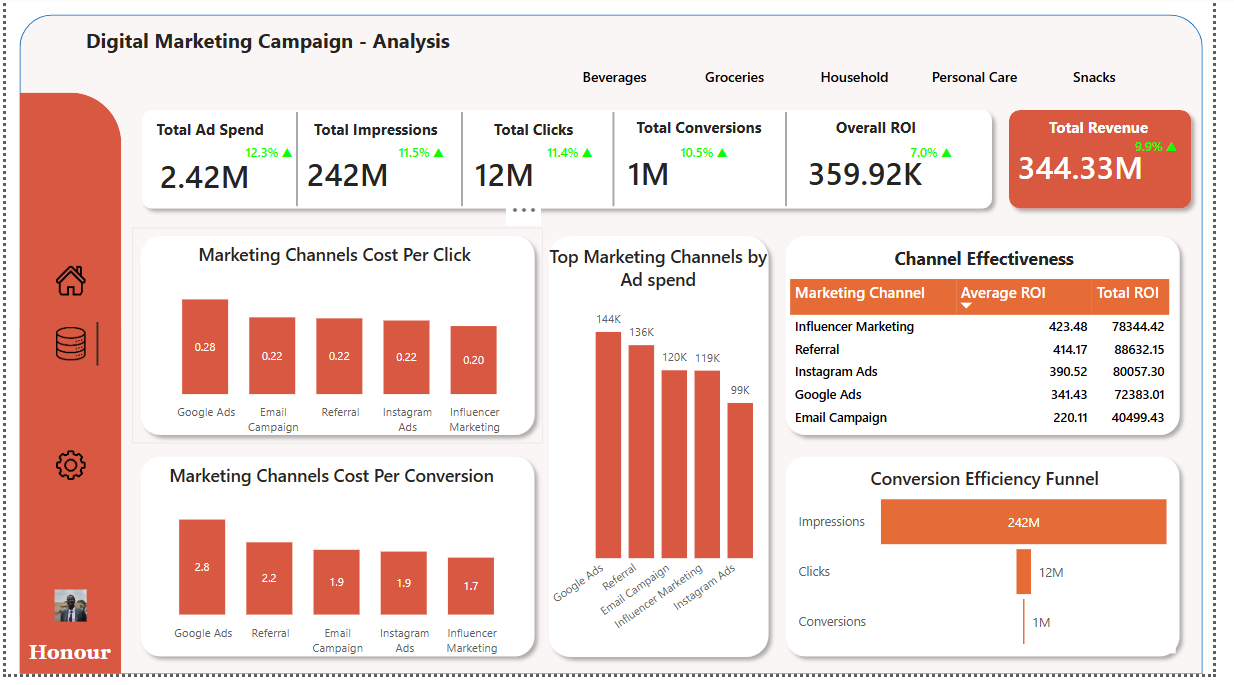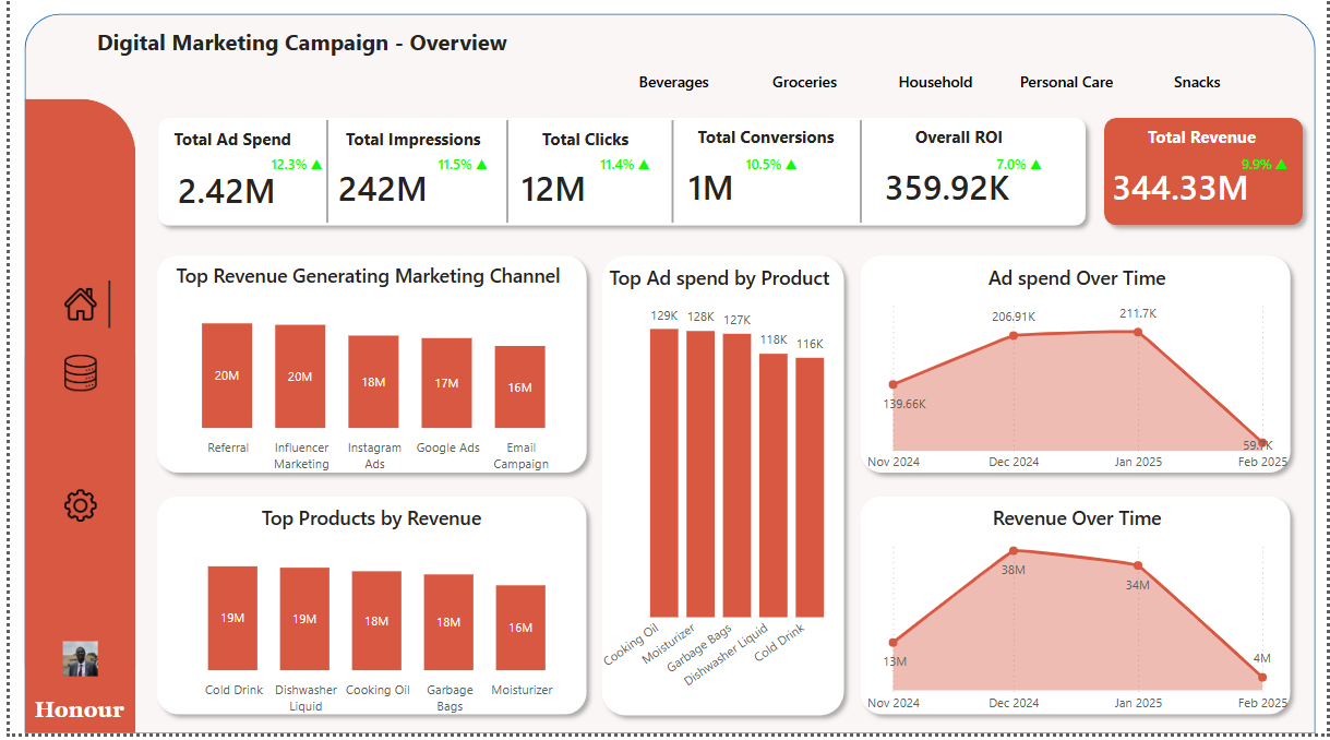 I analyzed multi-channel digital marketing campaigns to evaluate ad spend efficiency, ROI, and conversion performance. Using Excel for preprocessing (Data Cleaning) and Power BI for data modeling and dashboards, I explored campaign performance across products, channels, and time periods.