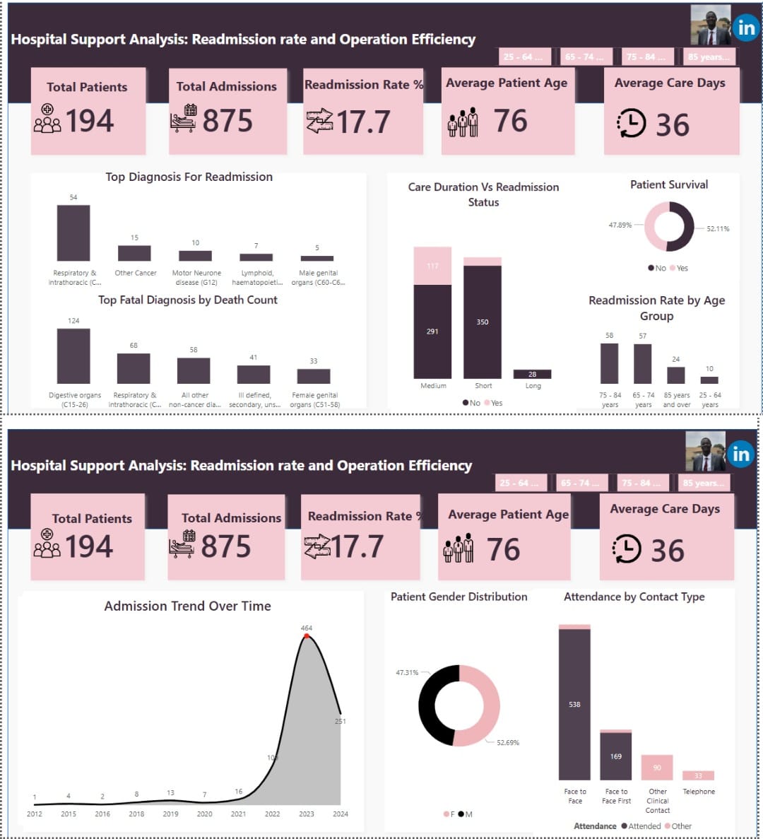 I analyzed hospital admissions data to uncover patterns in patient readmissions and identify ways to improve healthcare efficiency. Using Excel for preprocessing and Power BI for dashboards, I explored patient demographics, diagnosis-specific trends, care durations, and survival rates across community health, hospital support, and daycare services.