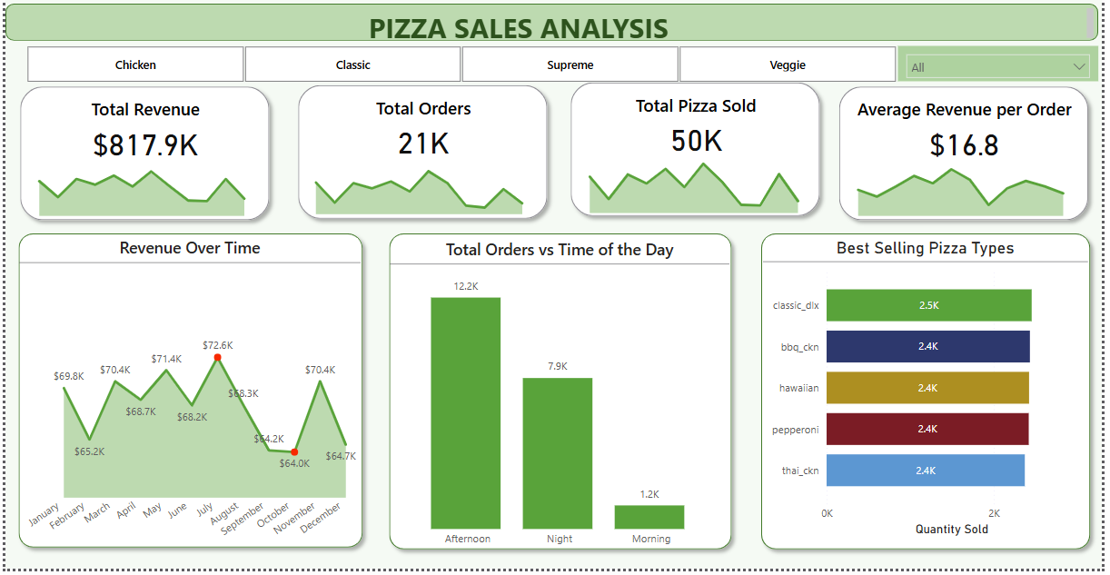 I designed a Power BI dashboard to analyze pizza sales performance across time, product type, and size. The project used Excel/CSV preprocessing, Power Query, and DAX for modeling, resulting in interactive visualizations that reveal sales patterns and revenue drivers.